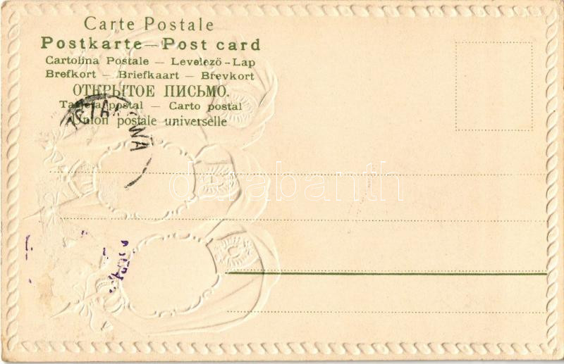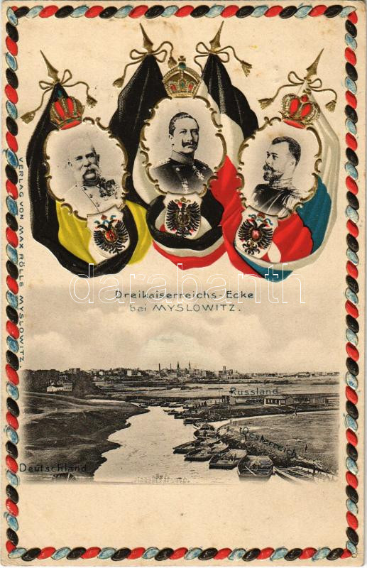 Myslowice, Myslowitz (Ober-Schlesien); Dreikaiserreichs Ecke: Deutschland, Oesterreich, Russland. Verlag Max Rölle / Three Emperors' Corner, German-Austro-Russian triple border, Franz Joseph, Wilhelm II and Nicholas II of Russia on coins. Coat of arms, Embossed Art Nouveau litho / Német-osztrák-orosz határ. Szecessziós, dombornyomott litho címerekkel és az uralkodók képeivel