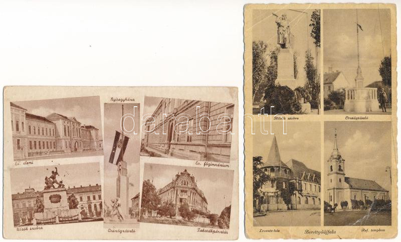Description: 2 db RÉGI magyar város képeslap országzászlóval, vegyes minőségben: Berettyóújfalu, Nyíregyháza / 2 pre-1945 Hungarian town-view postcards with Hungarian country flags, mixed quality