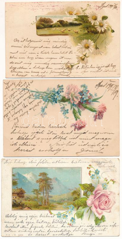 3 db RÉGI hosszú címzéses litho üdvözlő motívum képeslap vegyes minőségben 1899-ből / 3 pre-1900 litho greeting motive postcards in mixed quality