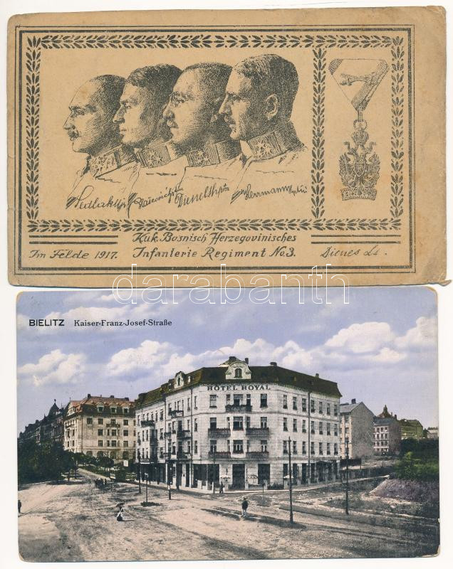 Description: 3 db régi képeslap vegyes minőségben: Bielitz (Bielsko), 2 első világháborús osztrák-magyar katonai képeslap (K.u.k. Bosnisch Herzegovinisches Infanterie Regiment No. 3.)