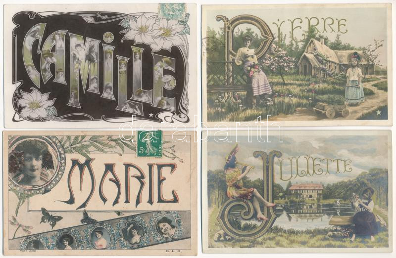 30 db RÉGI francia romantikus üdvözlő képeslap: nevek és betűk / 30 pr...