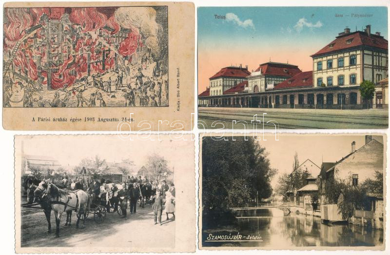 Description: 4 db RÉGI képeslap vegyes minőségben: Tövis vasútállomás, budapesti Párisi áruház égése, erdélyi esküvő fotója, Szamosújvár sétatér / 4 pre-1945 postcards in mixed quality