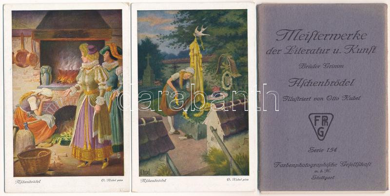 Description: Aschenbrödel. Brüder Grimm, Illustriert von Otto Kubel - F.R.G. Serie 154. / Hamupipőke - régi képeslap sorozat 6 lappal tokban / Cinderfella - pre-1945 postcard series with 6 postcards in case