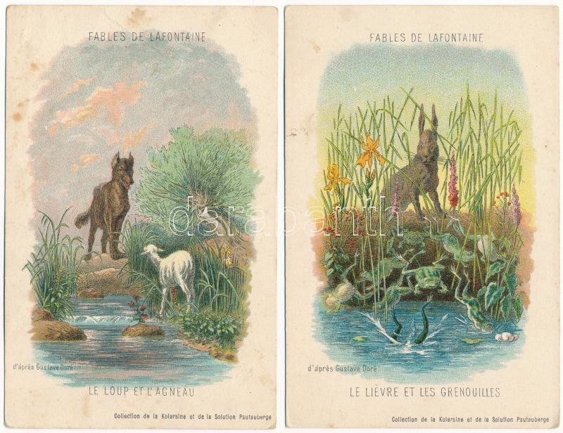 Fables de Lafontaine - 18 db RÉGI francia mese lap, hátoldalakon szöveggel / 18 pre-1945 French fable motive cards (non-PC)