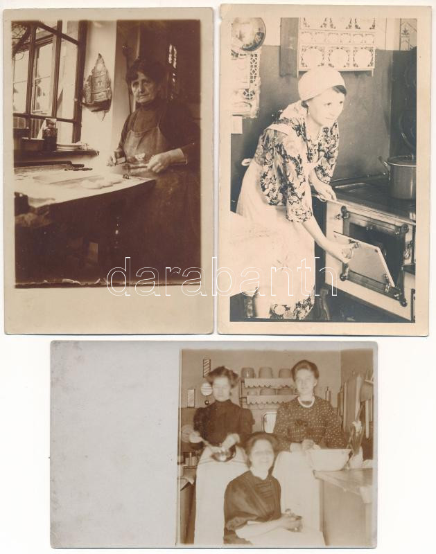 3 db régi fotó képeslap: régi konyhabelsők / 3 pre-1945 photo postcards: old kitchen interiors
