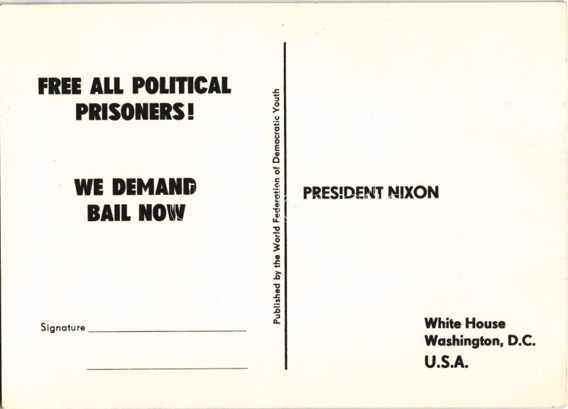 1970 Free Angela Davis. Published by the World Federation of Democratic Youth. Printed address line of President Nixon