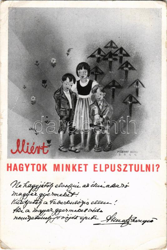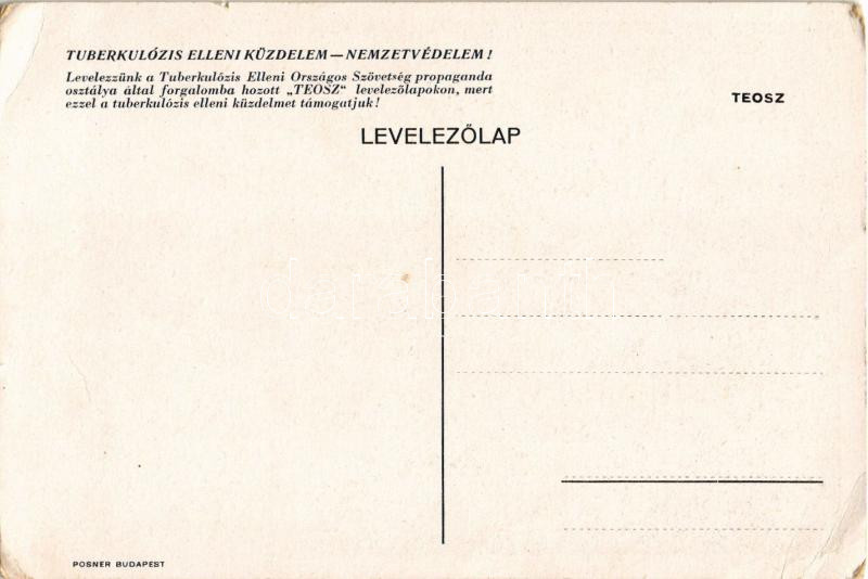 Miért hagytok minket elpusztulni? - Tuberkulózis elleni küzdelem - nemzetvédelem! Levelezzünk a Tuberkulózis Elleni Országos Szövetség propaganda osztálya által forgaloma hozott "TEOSZ" levelezőlapokon, mert ezzel a tuberkulózis elleni küzdelmet támohgatjuk! / Hungarian propaganda, national organization's charity fund for the fight against tuberculosis s: Morvay Klára (EB)