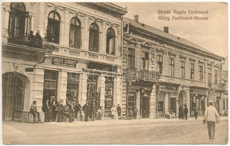 Description: Vatra Dornei, Dornavátra, Bad Dorna-Watra (Bukovina, Bukowina); Strada Regele Ferdinand / König Ferdinand-Strasse / street view, shop of Baroch Schnarch (EK)