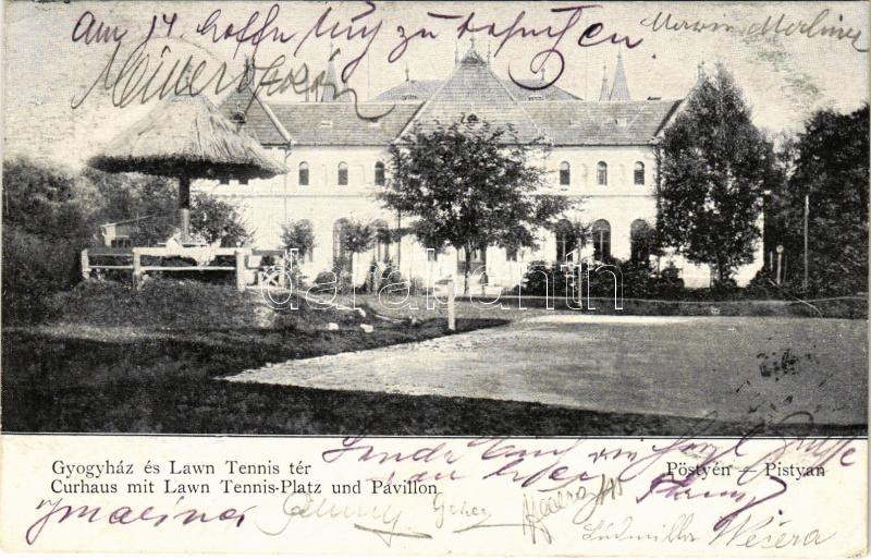 1900 Pöstyén, Pistyan, Piestany; Gyógyház és Lawn Tennis tér, teniszpálya, pavilon / Curhaus mit Lawn Tennis-Platz und Pavillon / spa, tennis court and pavilion