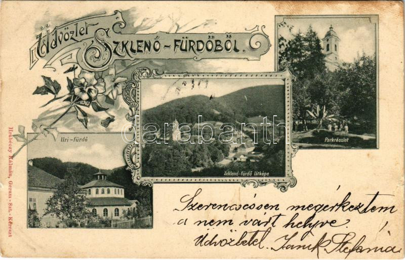 1900 Szklenófürdő, Sklené Teplice; Úri fürdő, látkép, park. Hrabéczy Kálmán kiadása / spa, bath, general view, park. Art Nouveau, floral (EB)