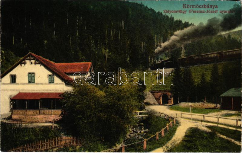 Description: 1913 Körmöcbánya, Kremnitz, Kremnica; Zólyomvölgy, Ferenc József nyaraló, vasút, gőzmozdony. Ritter Sándor kiadása / valley, villa, locomotive, railway tunnel (r)