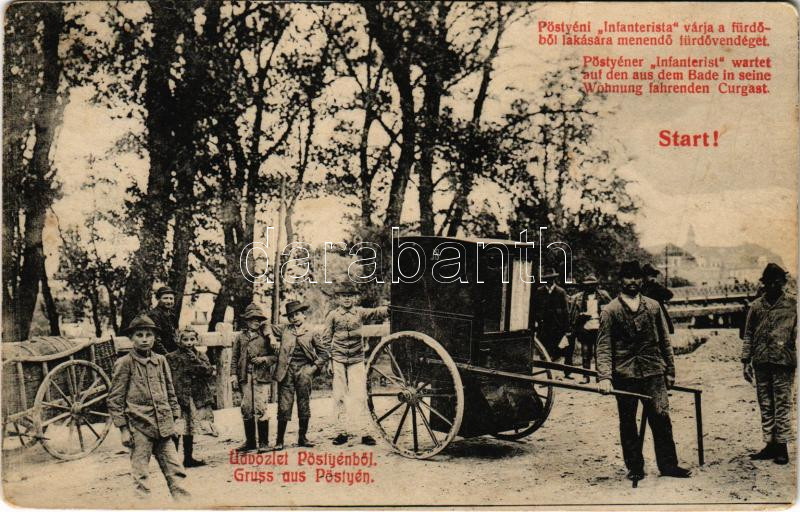 1913 Pöstyén, Piestany; Infanterista várja a fürdőből lakására menendő fürdővendéget. Gipsz H. kiadása / Infanterist / spa carriage. Start! (kopott sarkak / worn corners)