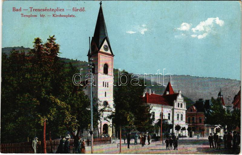 1918 Trencsénteplic, Trencianske Teplice; Templom tér. Wertheim Zsigmond kiadása / Kirchenplatz / square, church (EK)