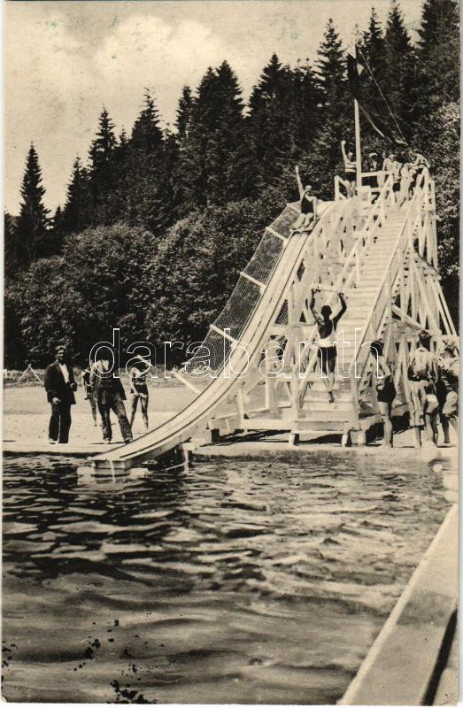 1931 Felsőzúgó-fürdő, Ruzsbachfürdő, Bad Ober Rauschenbach, Kúpele Vysné Ruzbachy; Strand, fürdőzők, csúszda / Toboggan / beach, bathers, slide