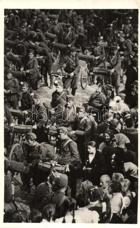 1938 Ipolyság, Sahy; bevonulás, kerékpáros katonák / entry of the Hungarian troops, soldiers with bicycles. So. Stpl