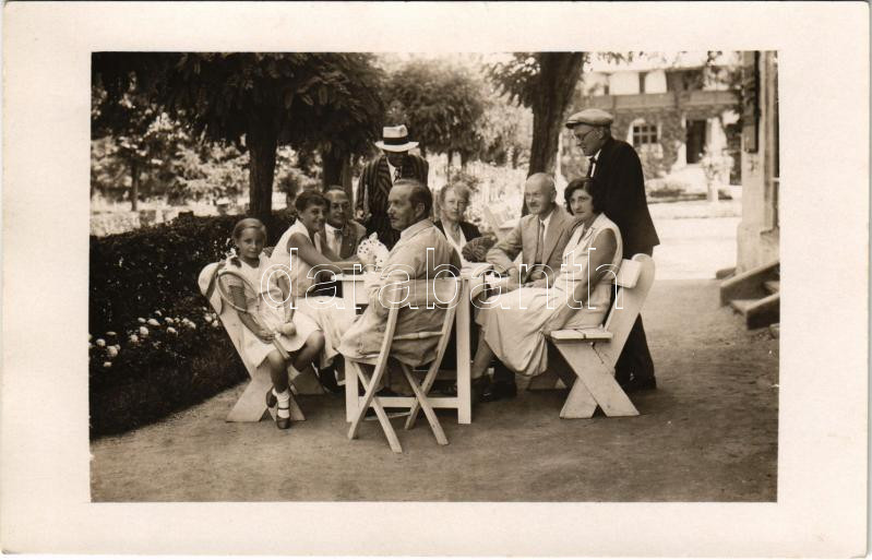 Csíz, Csízfürdő, Kúpele Cíz; kártyázás a kertben, családi fotó / playing card games in the garden, family photo. Foto Atelier Body
