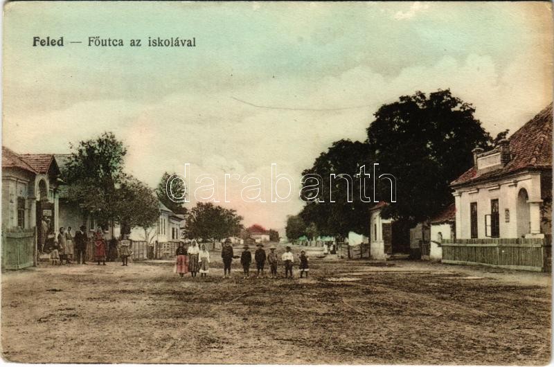 Feled, Veladin, Jesenské; Fő utca, iskola, üzlet. Vasúti levelezőlapár...