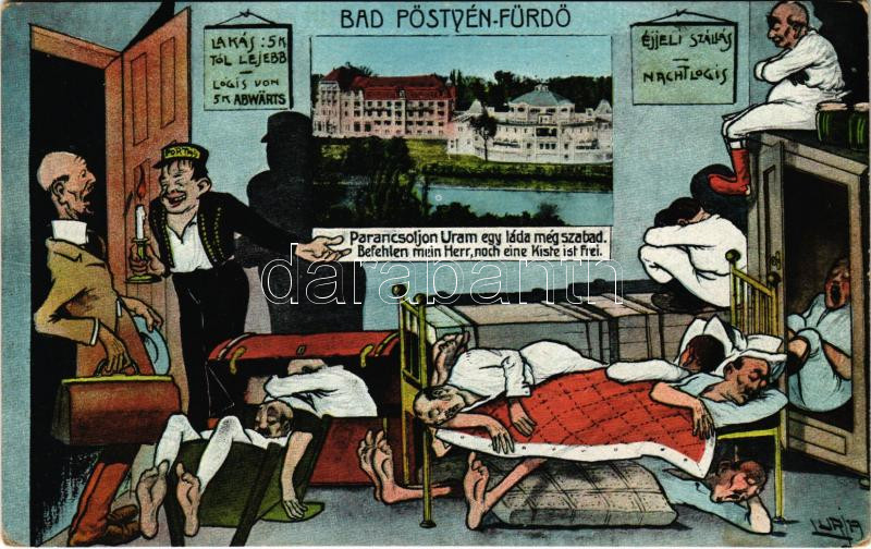Pöstyénfürdő, Kúpele Piestany; Parancsoljon Uram, egy láda még szabad. Humoros montázs éjjeli szállással. Donáth Lipót kiadása / Humorous montage with spa guests s: Lurja + "Vörös kereszt Hadikórház katonai ápolási ügyben portómentes" (EK)
