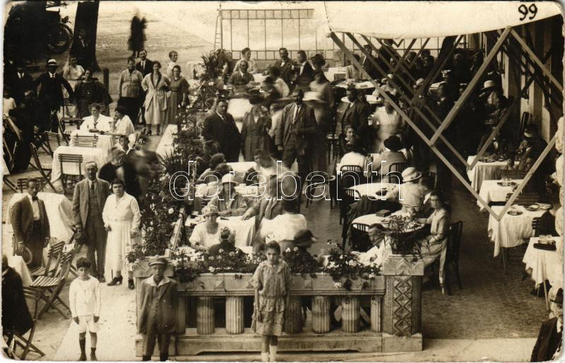 Description: Trencsénteplic, Trencianske Teplice; Caffee Grand Hotel nagyszálloda és kávéház terasza vendégekkel / spa hotel and café, terrace with guests. M. Stern photo (kopott sarkak / worn corners)