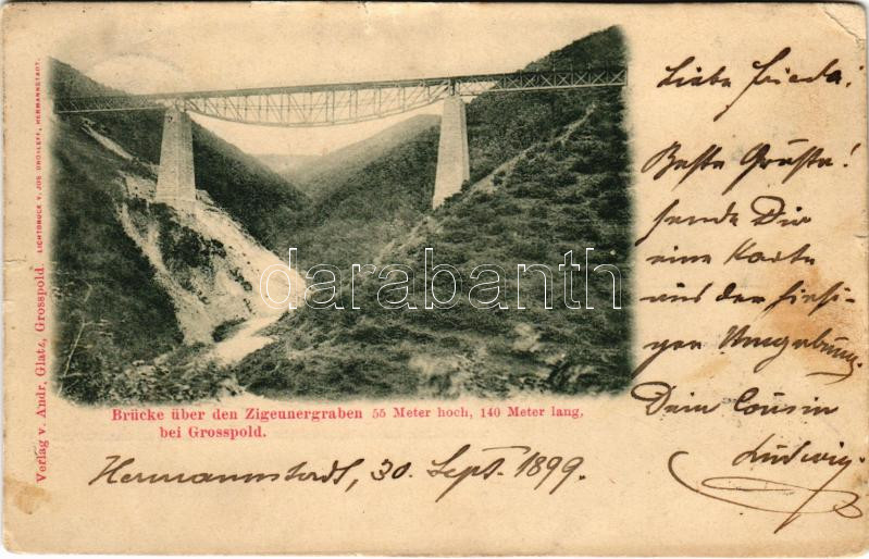 1899 (Vorläufer) Nagyapold, Grosspold, Apoldu de Sus; Ördög-vasúti híd a Cigány-árok felett, gőzmozdony, vonat. Andr. Glatz kiadása / Brücke über den Zigeunergraben / railway bridge, viaduct, locomotive, train (szakadások / tears)