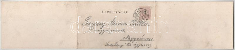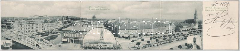 1899 (Vorläufer) Nagyvárad, Oradea; Fő tér, híd, piac, Janky Antal, Goldman Horváth István és Huzella M. üzlete, Gazdasági és Iparbank, zsinagóga, kávéház és szálloda. 3-részes kinyitható panorámalap / main square, market, bridge, synagogue, shops, bank, cafe and hotel. 3-tiled folding panoramacard (EK)