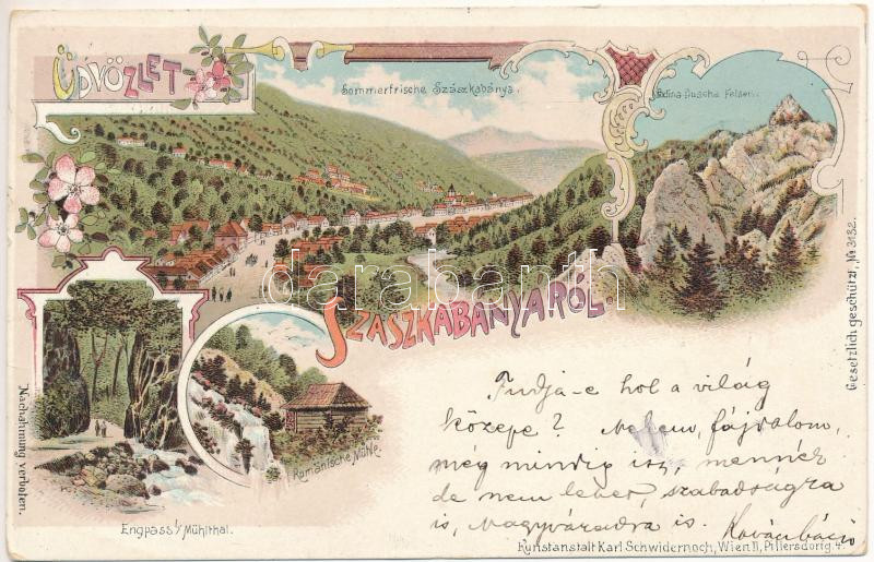 1899 (Vorläufer) Szászkabánya, Németszászka, Sasca Montana; Román malom, völgy sétány, szikla / Engpass i. Mühlthal, Rumänische Mühle, Padina Duscha Felsen / Romanian mill, valley path, rocks. Art Nouveau, floral, litho