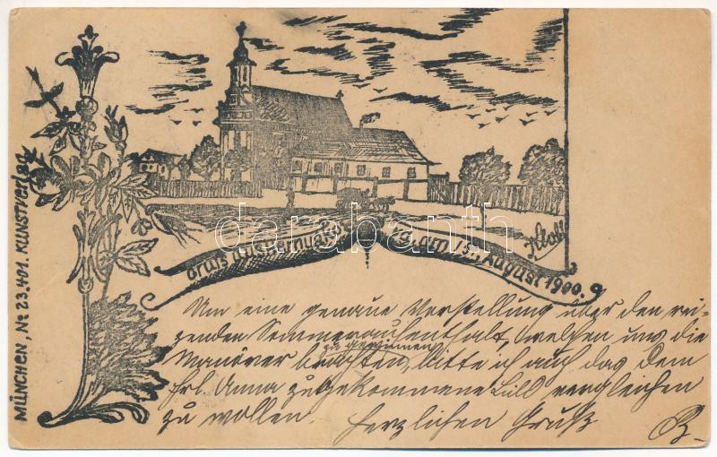 1900 Aranyág, Hernyákova, Herneacova (Temes); templom. Kézzel rajzolt szecessziós lap / church. Art Nouveau, floral hand-drawn s: Klobl (?) (EK)
