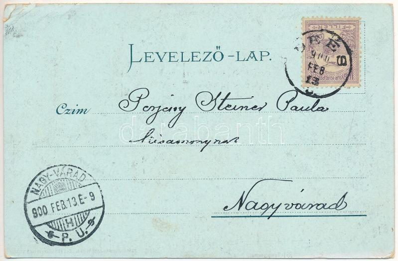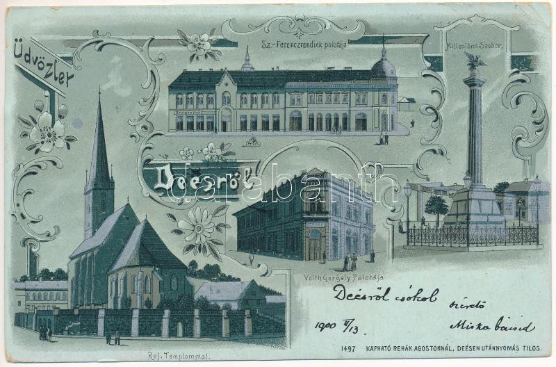 1900 Dés, Dej; Szt. Ferenc rendiek palotája, református templom, Millenniumi szobor (1919-ben ledöntötték), Voith Gergely palotája. Kapható Rehák Ágostonnál / church, palace, monument (demolished in 1919). Art Nouveau, floral, litho (EB)