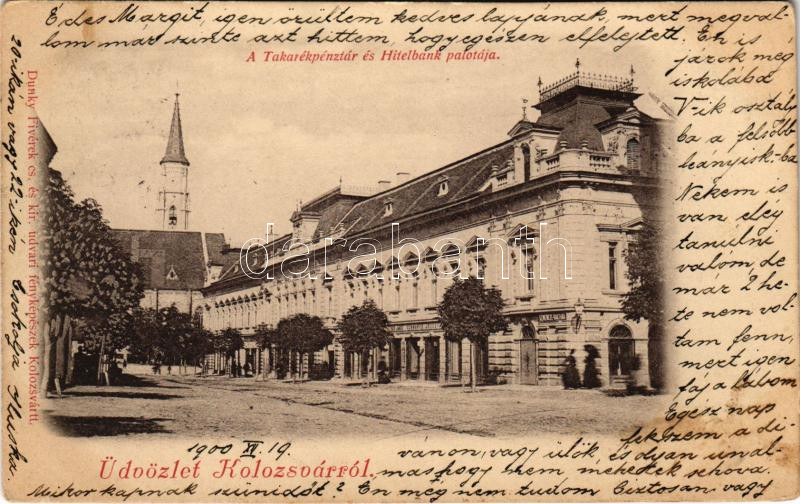 1900 Kolozsvár, Cluj; Takarékpénztár és Hitelbank palotája, Schwartz József üzlete, kemence raktár. Dunky Fivérek kiadása / savings bank palace, shops