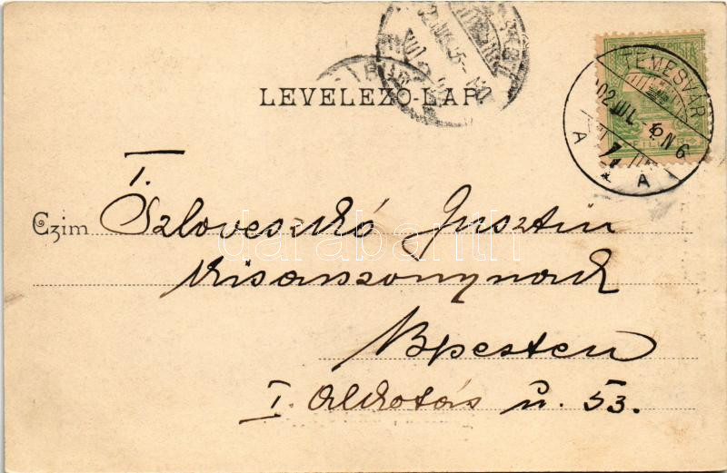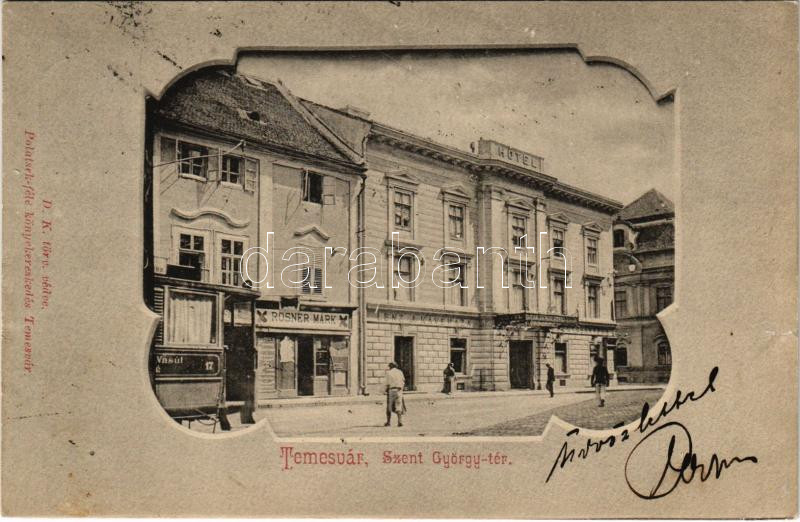 1902 Temesvár, Timisoara; Szent György tér, Lenz J. kávéháza, szállodája és sörcsarnoka, Rosner Márk üzlete, villamos. Polatsek kiadása / square, hotel, beer hall and cafe, tram, shop