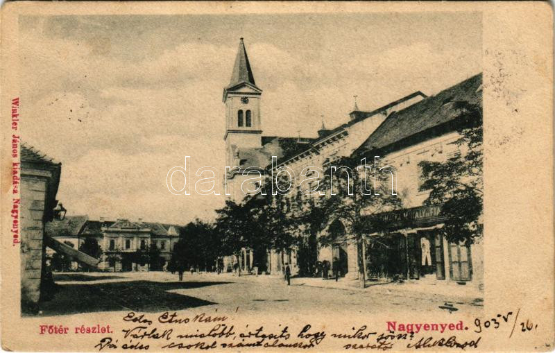 1903 Nagyenyed, Aiud; Fő tér részlet, üzlet, templom. Winkler János ki...