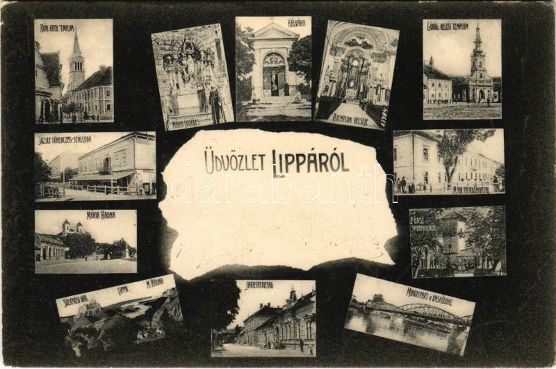 1908 Lippa, Lipova; Római katolikus templom, Mária Lourdes, Kálvária, templom belső, Görögkeleti (ortodox) templom, József főherceg szálloda, M. kir. főerdőhivatal, Máriaradna, Solymosi vár, Járásbíróság, Marospart a vashíddal, Savanyúkút fürdő. Zeitler Lajos kiadása / Catholic church, calvary, Orthodox church, hotel, forestry office, Radna, Soimos castle, district court, Mures riverside with iron bridge, Sauerbrunn spa (EK)