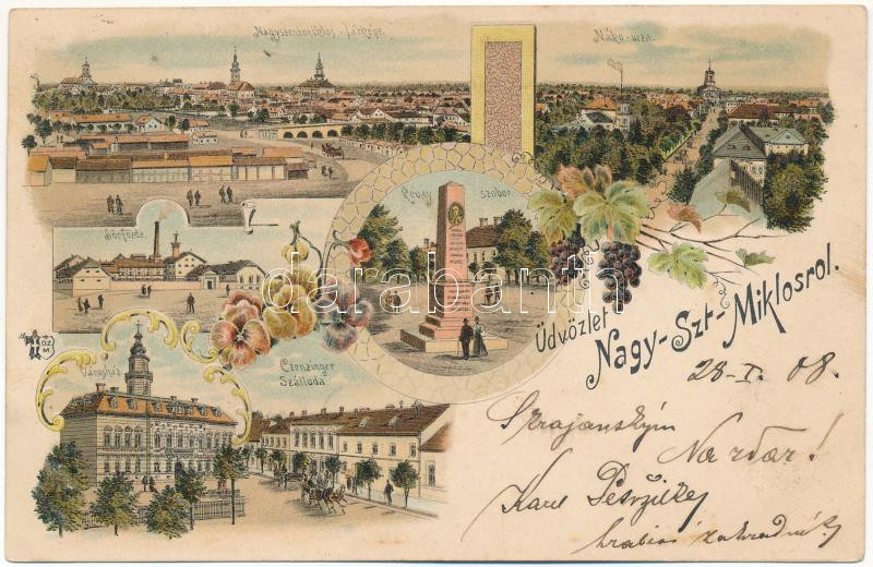 1908 Nagyszentmiklós, Sannicolau Mare; Náko utca, Sörfőzde, sörgyár, városháza, Czenzinger szálloda, Révay szobor / street, town hall, brewery, hotel, statue. O.Z.M. Art Nouveau, floral, litho