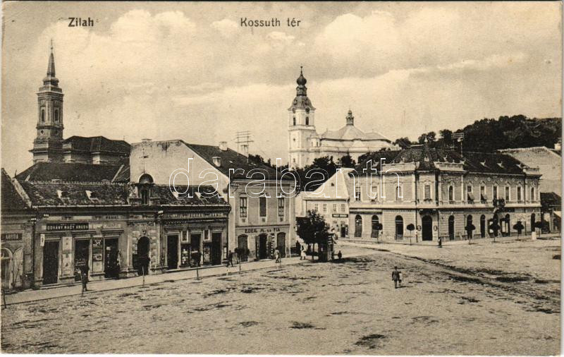 1915 Zilah, Zalau; Kossuth tér, templomok, Dohány nagy áruda, Pergei fodrász, Seres Lajos és Samu, Éder M. és fia, Nagy Árpád üzlete, könyvnyomda, Enyveshát. Seres Samu kiadása / square, churches, shops, hairdresser (kis szakadás / small tear)