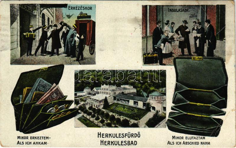 Description: 1923 Herkulesfürdő, Herkulesbad, Baile Herculane; Érkezéskor és induláskor, humoros lap pénztárcával / On arrival and departure, humour with wallets (r)
