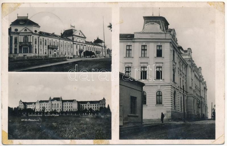 Description: 1940 Csíkszereda, Miercurea Ciuc; Törvényszék, Római katolikus gimnázium, Vármegyeháza. Seiwarth foto kiadása / court, Catholic grammar school, county hall (fl)