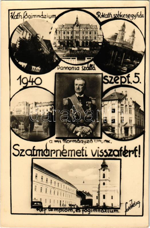 1940 Szatmárnémeti, Satu Mare; Római katolikus főgimnázium, székesegyház, Pannonia szálloda, Református templom és főgimnázium, Horthy Miklós kormányzó, "Szatmárnémeti visszatért!" / Catholic grammar school, cathedral, hotel, Calvinist church and grammar school, Regent Horthy. Foto Kósa photo (EK)