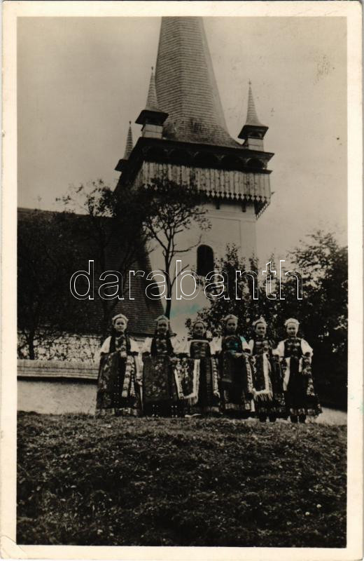 1941 Körösfő, Izvoru Crisului (Kalotaszeg, Tara Calatei); Református templom előtt, erdélyi népviselet / Calvinist church, Transylvanian folklore (EK)