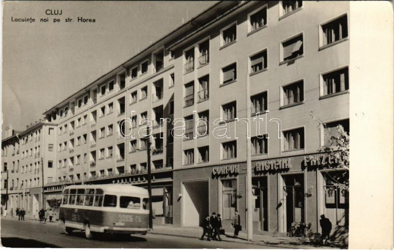 1970 Kolozsvár, Cluj; Locuinte noi pe Str. Horea, Coafor, Higiena, Frizer / utca, fodrász üzlet, autóbusz / street, hairdresser shop, bus (EK)