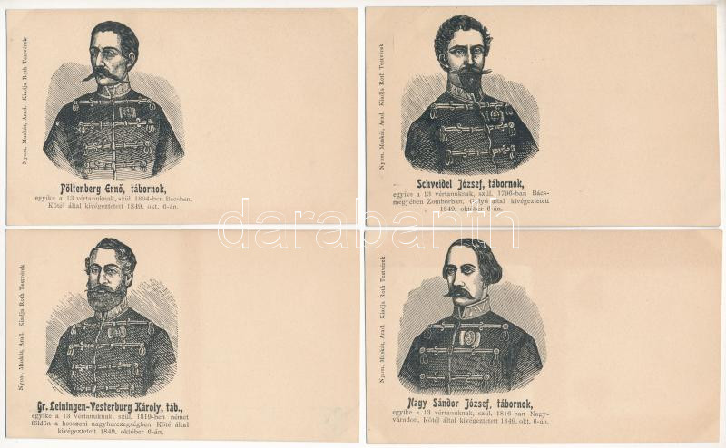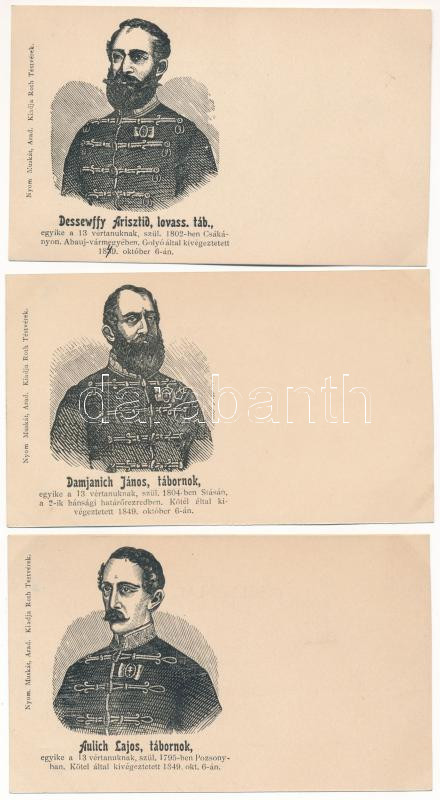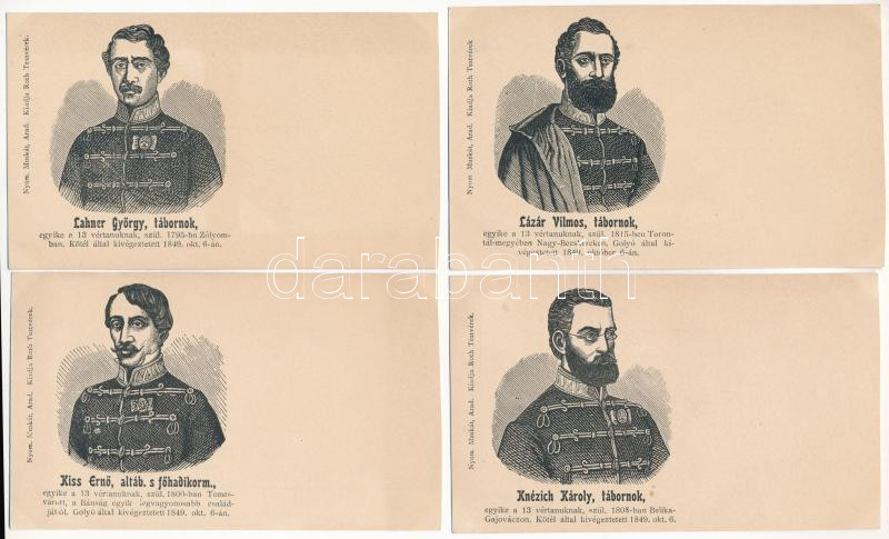Description: Arad, 13 Aradi Vértanú. Nyom. Muskát, kiadja Roth Testvérek - 13 db nagyon ritka régi hosszú címzéses képeslap, a komplett sorozat nagyon szép állapotban / The 13 Martyrs of Arad - 13 very rare pre-1900 postcards, the full series in beautiful condition