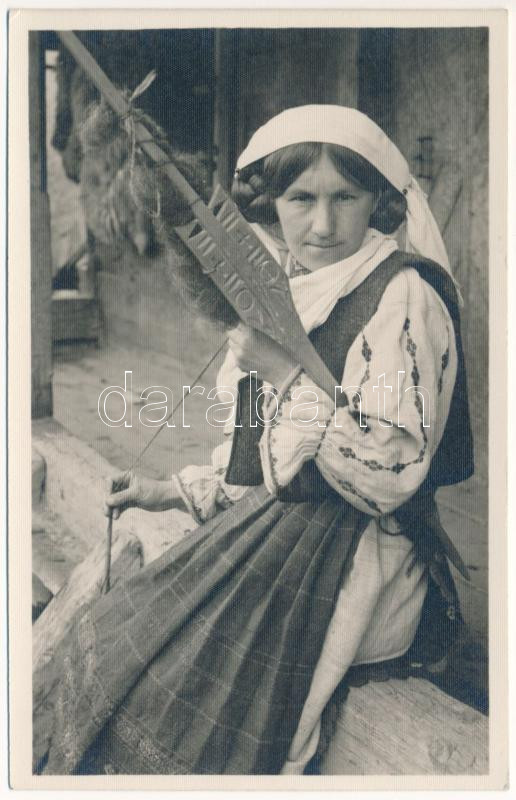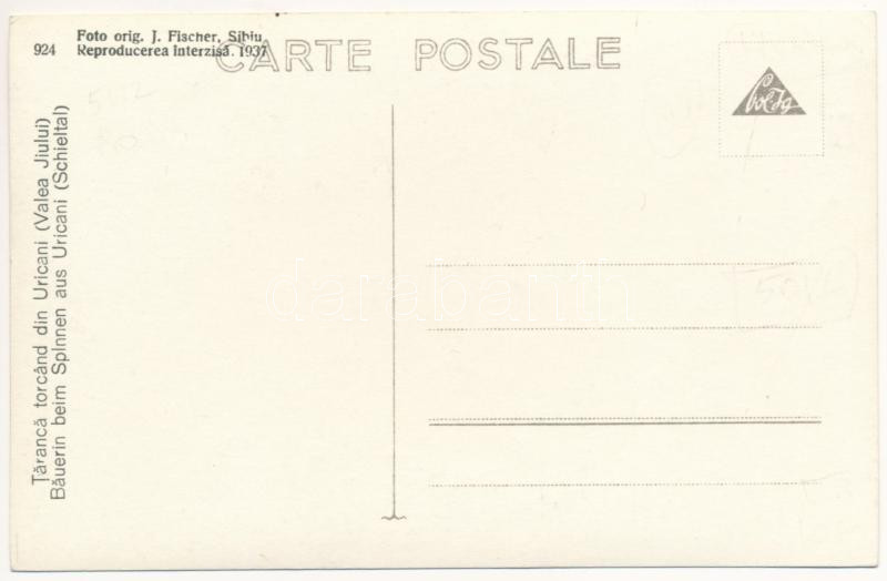Hobicaurikány, Urikány, Uricani (Hunyad); Taranca torcand din Uricani (Valea Jiului) / Bäuerin beim Spinnen aus Uricani (Schieltal) / erdélyi folklór / Transylvanian folklore. Foto orig. J. Fischer (EK)