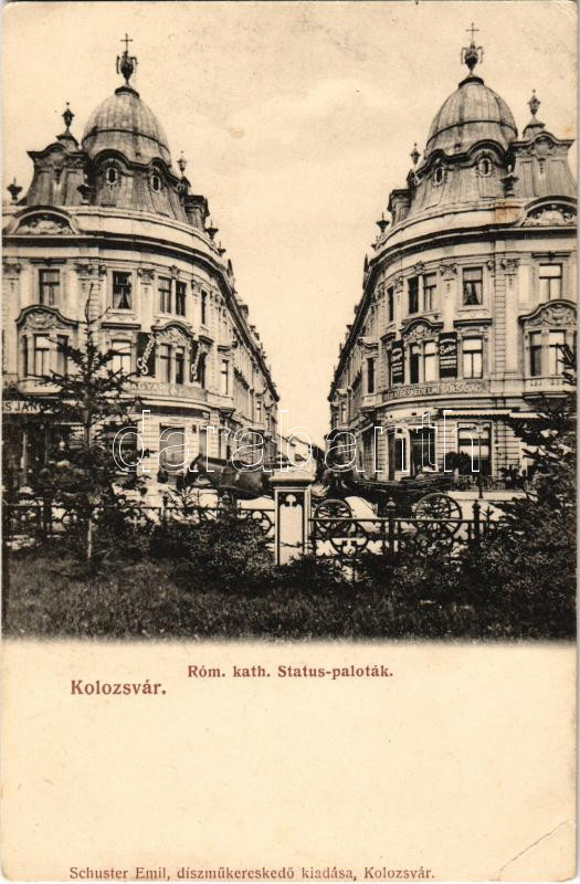 Description: Kolozsvár, Cluj; Római katolikus Státus paloták, Generali biztosító, Erdélyi Kereskedelmi Társaság. Schuster Emil kiadása / Catholic palaces, insurance company, trade company (EB)