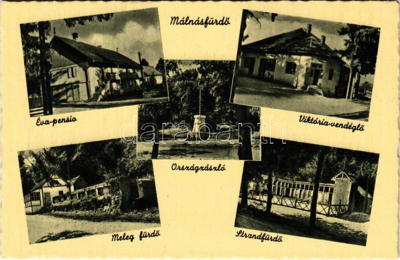 Málnásfürdő, Malnas Bai; Éva penzió, Viktória vendéglő, étterem, Meleg fürdő, Strandfürdő, Országzászló / hotel, restaurant, thermal bath, spa, swimming pool (EK)