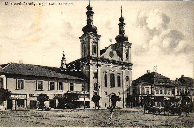 Marosvásárhely, Targu Mures; Római katolikus templom, Csiky Emil, Junger J., Kepes Adolf üzlete. Porjes S. Sándor kiadása / church, shops