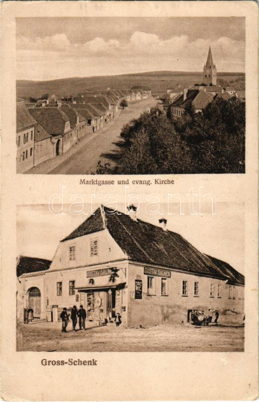 Description: Nagysink, Gross-Schenk, Cincul Mare, Cincu; Marktgasse und evang. Kirche / Fő utca, evangélikus templom, Gustav Salmen üzlete és saját kiadása / main street, Lutheran church, shop (EK)