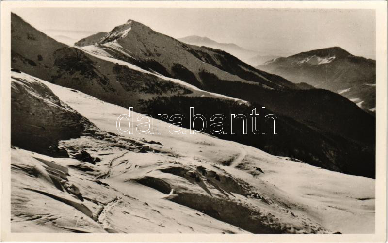 Radnai-havasok, Muntii Rodnei; Korongyos a Gargaló-hágó felől. Hensch Aladár felvétele. A Magyar Sí Klub kiadása / Coronghis / mountain peak