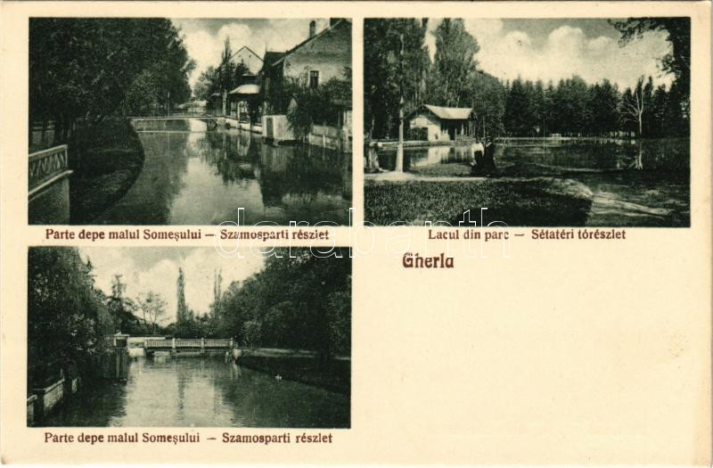 Description: Szamosújvár, Gherla; Parte depe malul Somesului, Lacul din parc, Parte depe malul Somesului / Szamos-parti részletek, Sétatéri tó. Todoran kiadása / Somes riverside, promenade, lake