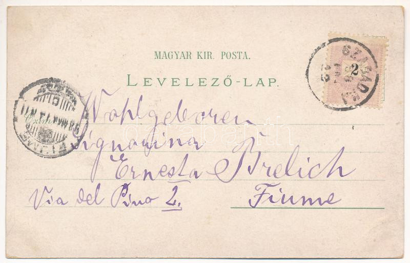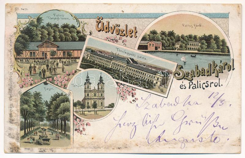 1898 (Vorläufer) Szabadka, Subotica; Palics fürdő, Társalgó terem, Fasor, Terézia templom, Törvényszéki palota / spa, hotel, Forensic Palace, court, church, promenade. Heumann Mór Art Nouveau, floral, litho (EK)