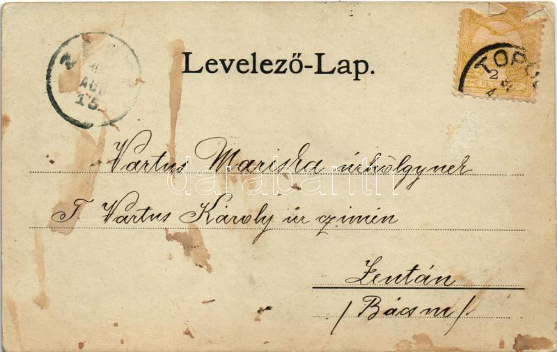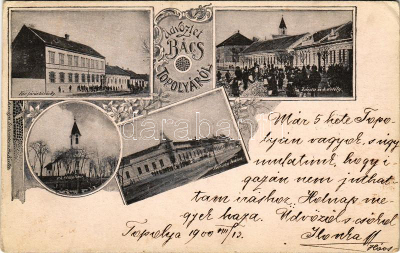 1900 Topolya, Bácstopolya, Backa Topola; Királyi járásbíróság, római katolikus templom, községháza, zárda és kastély. Schröder B. kiadása / county court, church, town hall, nunnery, castle. Art Nouveau, floral (Rb)