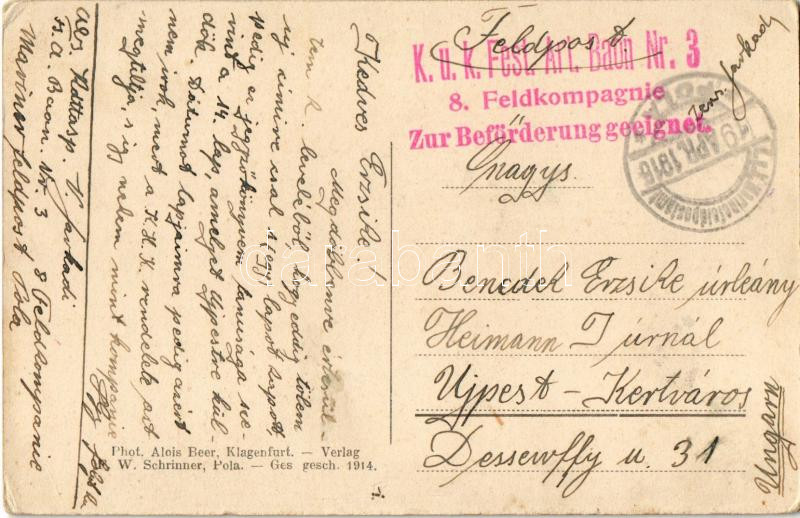 1915 "LILY" az Osztrák-Magyar Haditengerészet vitorlás jachtja / Kreuzeryacht Lilly. K.u.K. Kriegsmarine / Austro-Hungarian Navy cruiser yacht. Phiot. Alois Beer, F.W. Schrinner, Pola, 1914 (EK) + "K.u.k. Fest. Art. Baon Nr. 3. 8. Feldkompagnie zur Beförderung geeignet"